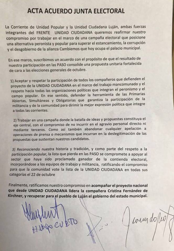 27/06/2017- Luego de las denuncias de proscripción de la Corriente de Unidad Popular, en la Junta Electoral y con la supervisión de Hugo Curto, los precandidatos por Unión Ciudadana, Miguel Prince y Leonardo Boto firmaron un acuerdo que aclara el panorama con vistas a las PASO 2017.