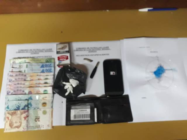 25/08/2018- El hecho ocurrió luego de la medianoche, en la localidad Jáuregui. Un hombre de 22 años fue detenido y se le incautaron “envoltorios de nylon contenido clorhidrato de cocaína, dinero, celular, y cigarrillo semi-combustionado marihuana”, indicó el parte policial.