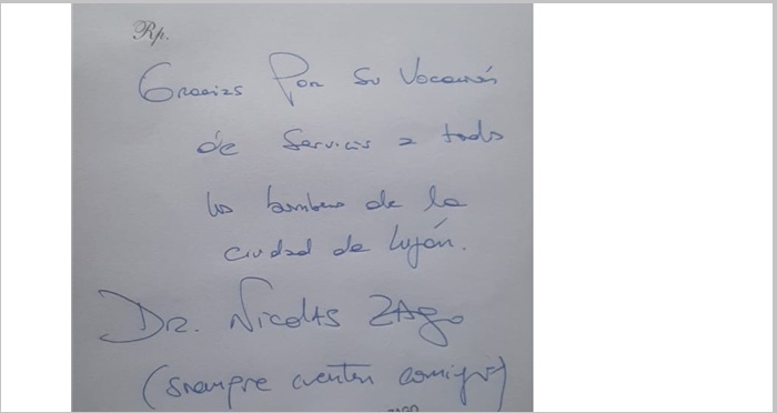 Asimismo, el médico les entregó un mensaje escrito en el recetario como muestra de su aprecio y gratitud: “Gracias por su vocación de servicio a todos los bomberos de la ciudad de Luján.”