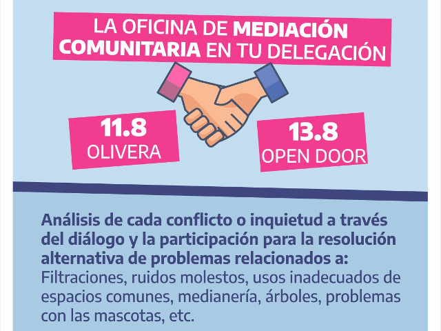 05/08/2020- Tendrá inicio con dos pruebas piloto: “el 11 de agosto en Olivera y el 13 en Open Door; en ambos casos en el horario de 9 a 12”, precisaron. Un servicio de carácter gratuito y confidencial, para diversos tipos de conflictos vecinales que no requieren judicialización -ruidos molestos, uso inadecuado de espacios comunes, medianería, problemas con árboles o mascotas y filtraciones, entre otros.